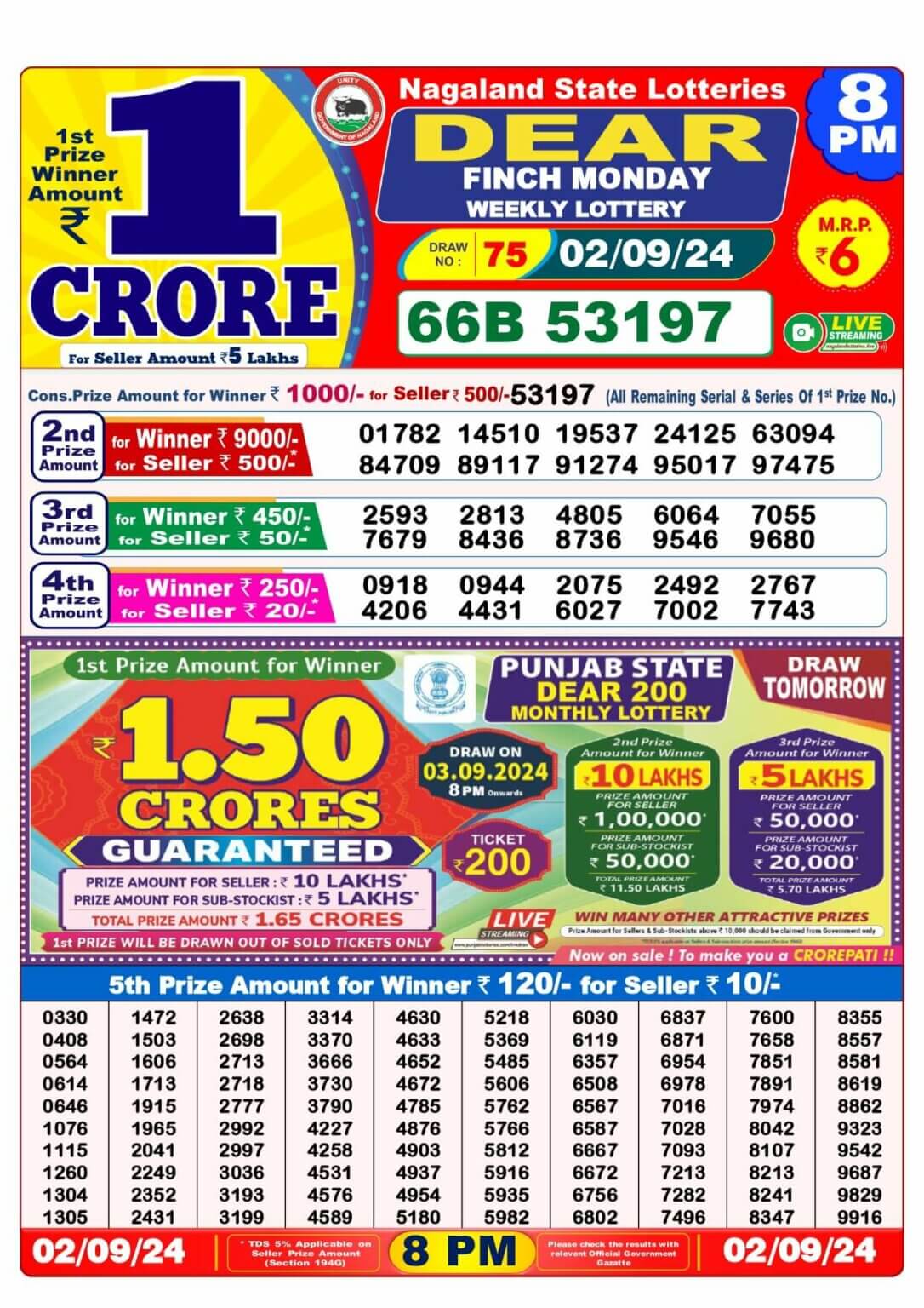 conducted by the Nagaland State Lottery. It includes daily draws at 1 PM, 6