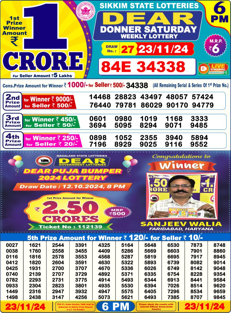 Lottery Sambad Result Today, November 23, 2024, 1 PM, 6 PM, 8 PM Draws, Live