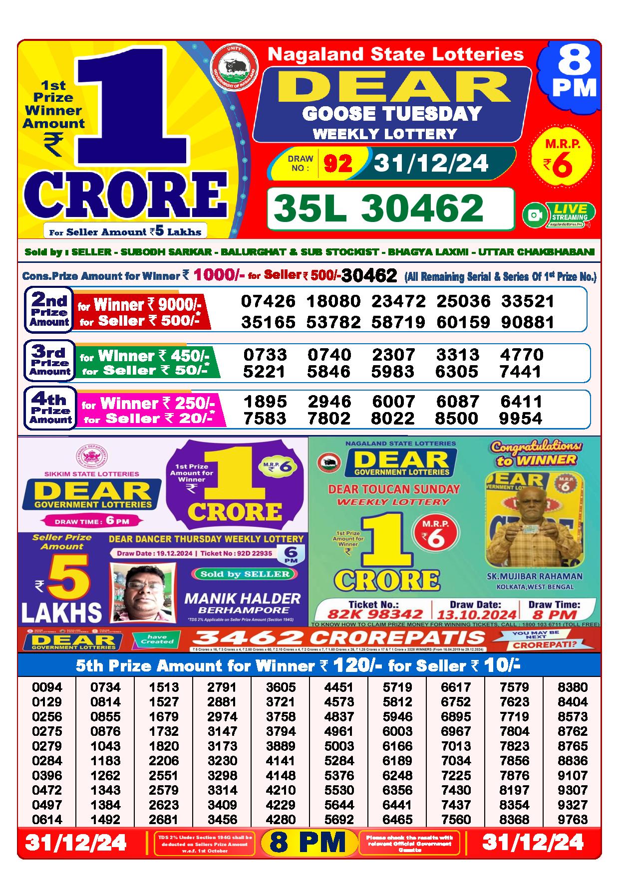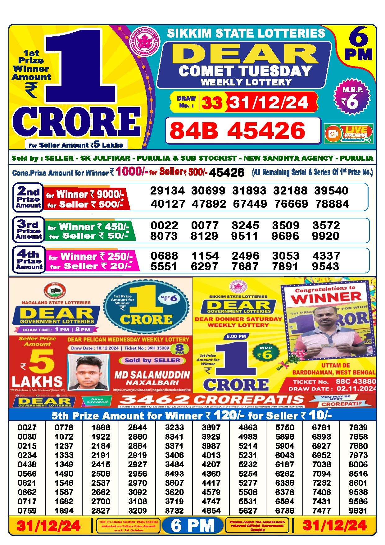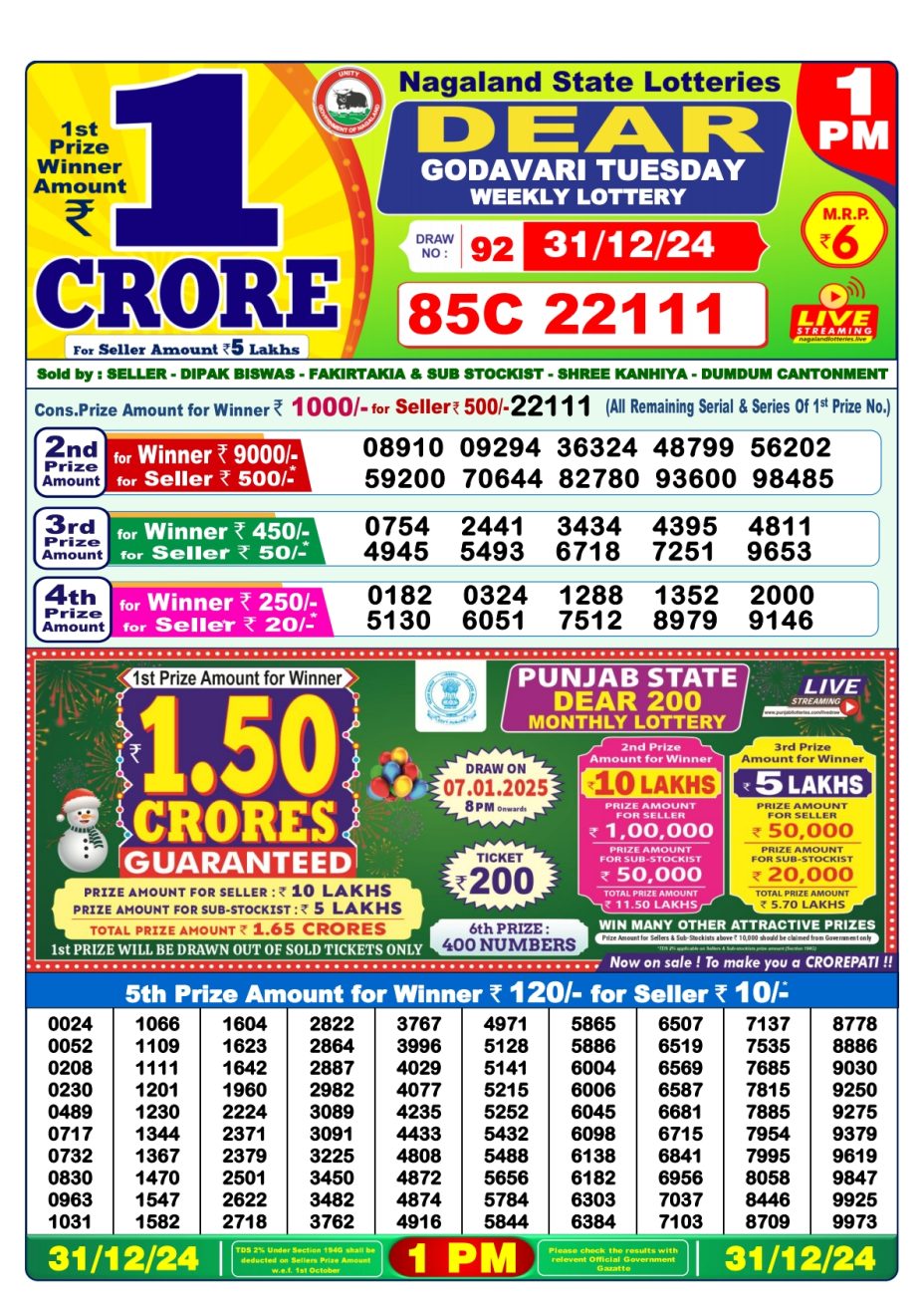 Lottery Sambad Result Today, December 31, 2024, 1 PM, 6 PM, 8 PM Draws, Live