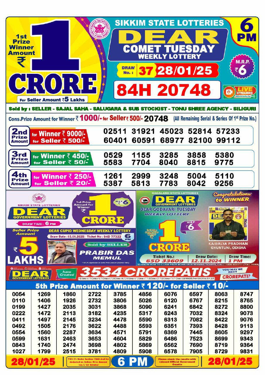 Lottery Sambad Result Today, January 28, 2025, 1 PM, 6 PM, 8 PM Draws, Live