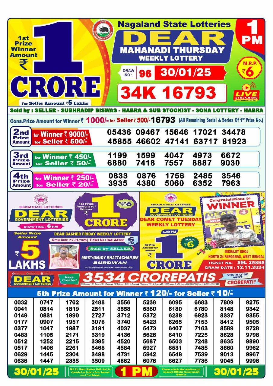 Lottery Sambad Result Today, January 30, 2025, 1 PM, 6 PM, 8 PM Draws, Live