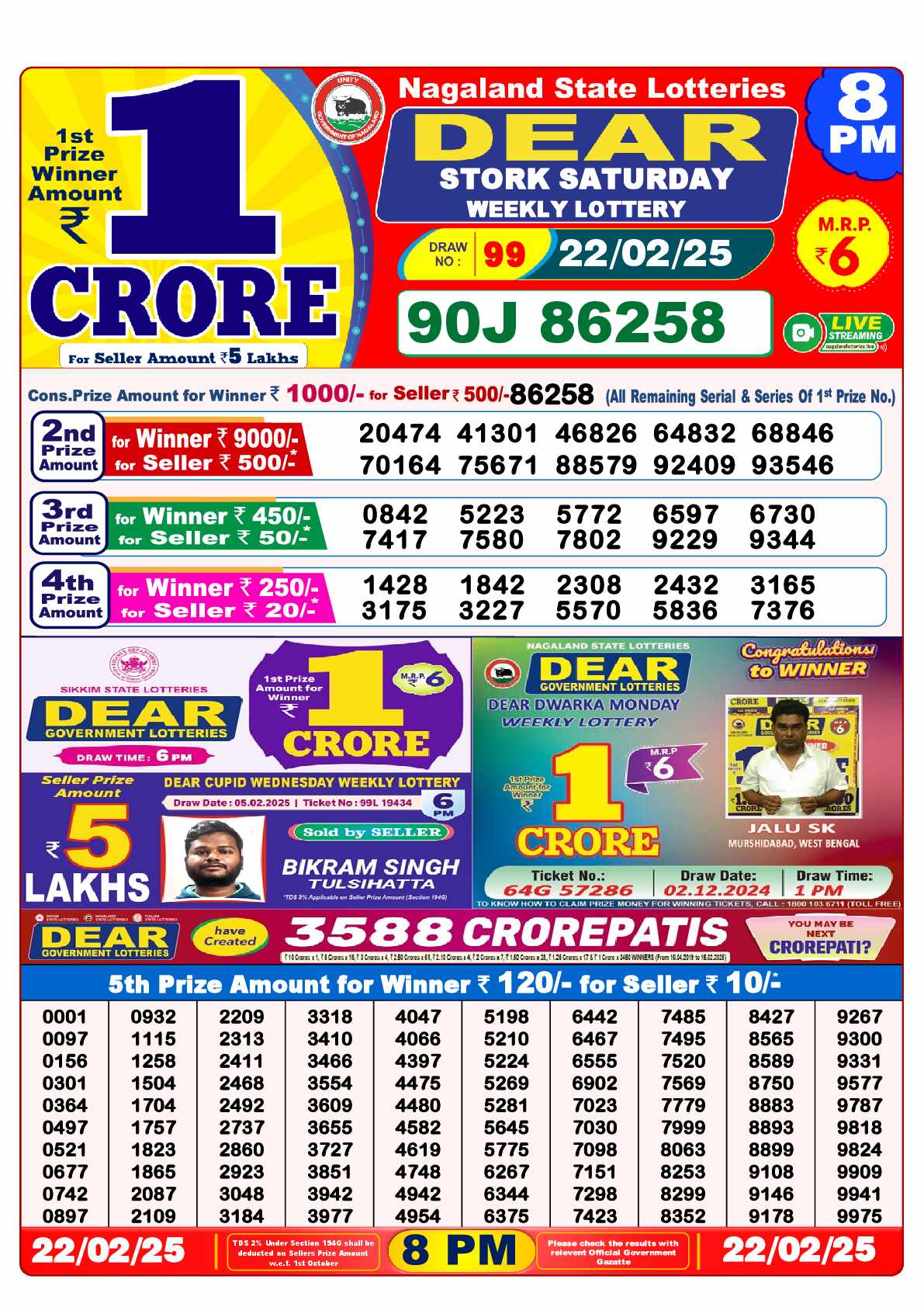 Lottery Sambad Result Today, February 22, 2025, 1 PM, 6 PM, 8 PM Draws, Live