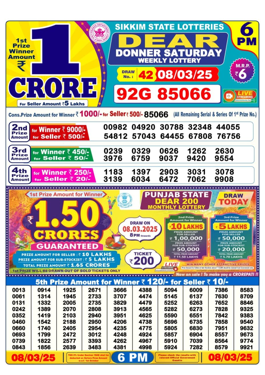 Saturday Lottery Result 2025 Today – Saturday (1 PM, 6 PM, 8 PM)