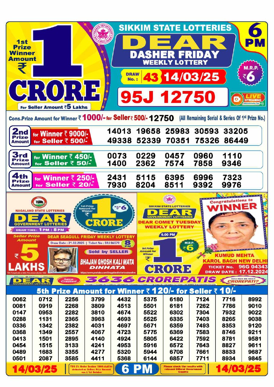 Lottery Sambad Result Today, March 14, 2025, 1 PM, 6 PM, 8 PM Draws, Live