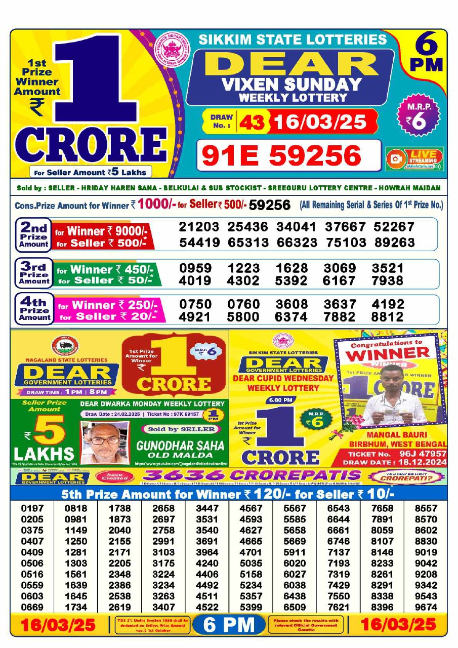 Lottery Sambad Result Today, March 16, 2025, 1 PM, 6 PM, 8 PM Draws, Live