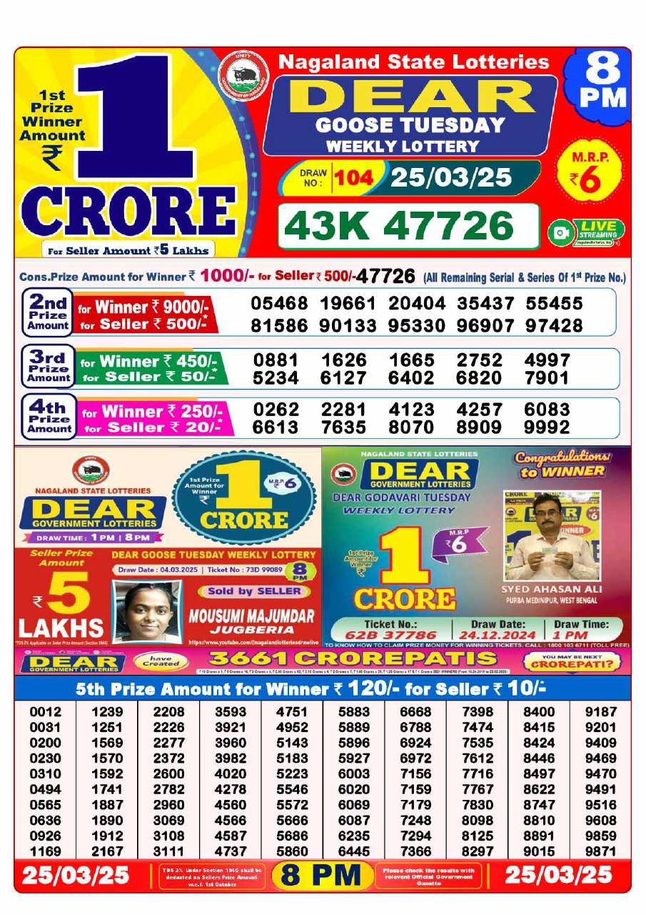 - 8 PM Draw: Nagaland State Lottery Results