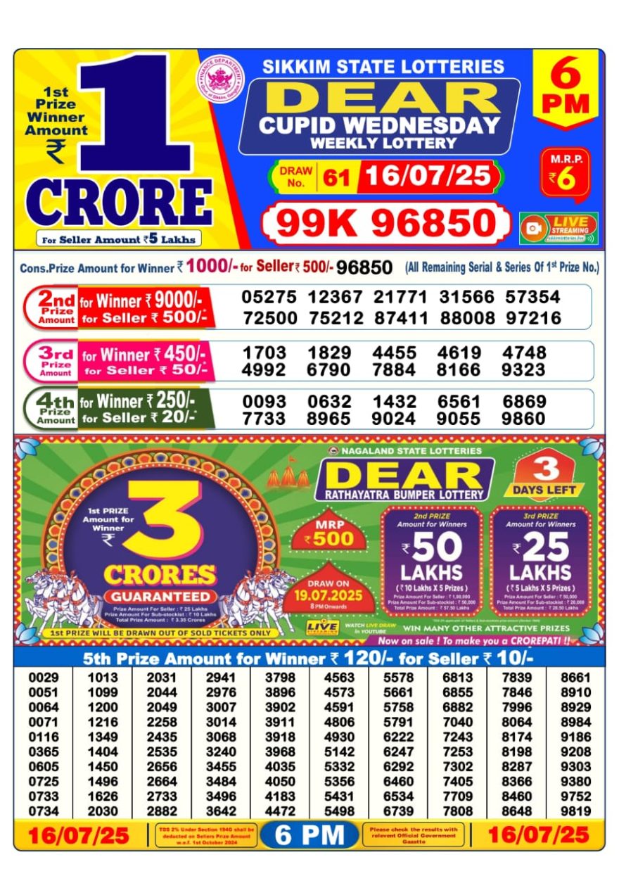 Lottery Sambad Result Today, July 16, 2025, 1 PM, 6 PM, 8 PM Draws, Live