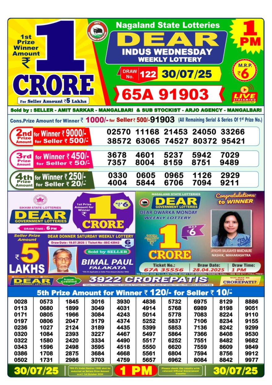 Lottery Sambad Result Today, July 30, 2025, 1 PM, 6 PM, 8 PM Draws, Live